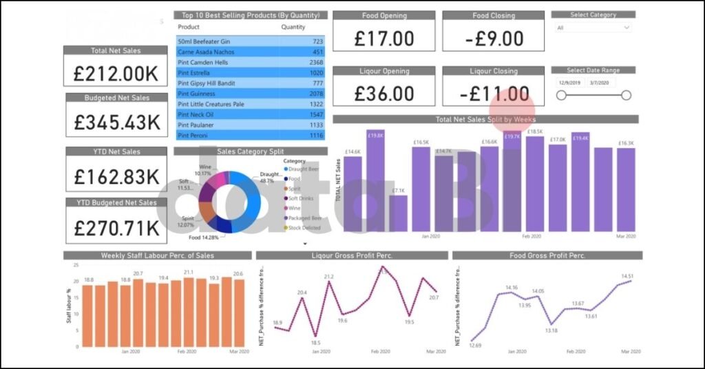 Bar Graph: A bar graph visually represents total net sales split by weeks, allowing you to pinpoint sales trends over time.